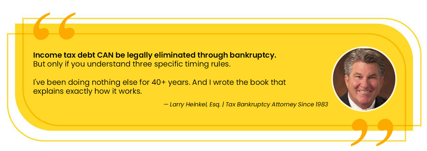 For 40+ years, Larry Heinkel has focused on one thing: helping taxpayers legally eliminate IRS debt through bankruptcy. He's not a tax relief company. He's not a call center. He's a licensed attorney who has spent his entire career mastering tax discharge law.